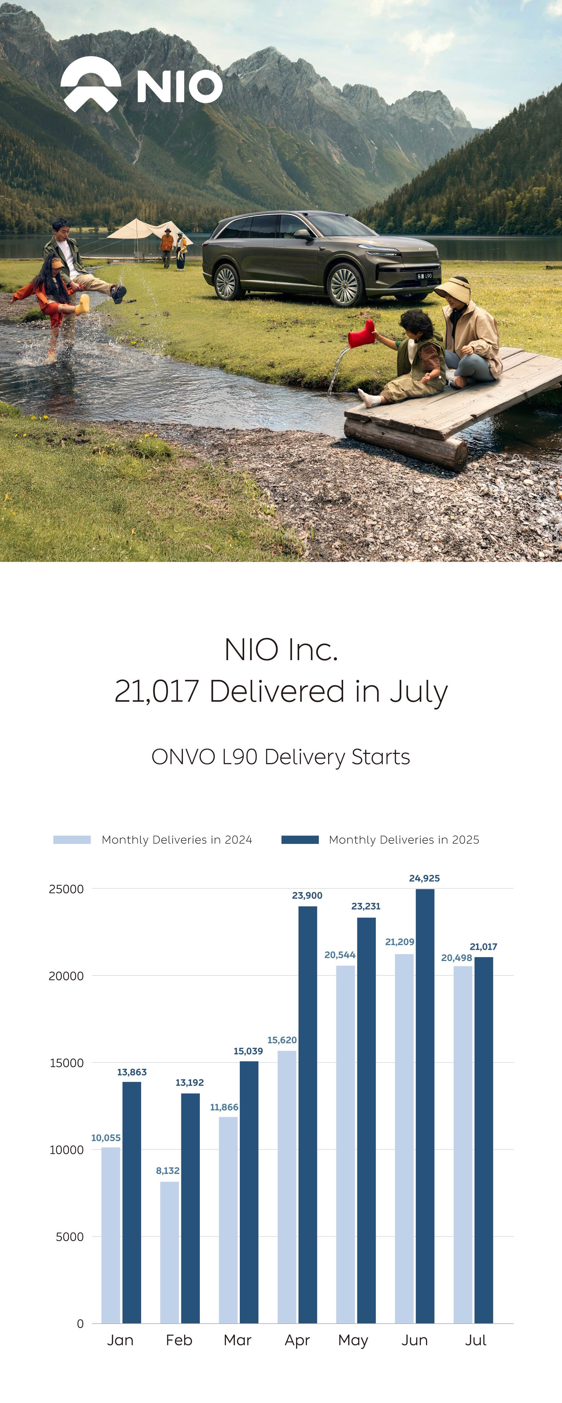 NIO Inc. Delivered 21,017 Vehicles in July, ONVO L90 Delivery Starts
